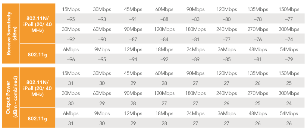 | WLAN Standard | IEEE 802.11 b/g/n, iPoll (Proprietary) |